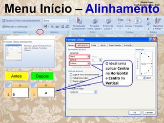O documento fornece instruções sobre como formatar números e datas no menu Início do Excel, incluindo opções para casas decimais, moedas, datas, porcentagens e formatos de telefone. Exemplos demonstram como aplicar esses formatos antes e depois, com alertas sobre cuidados ao usar arredondamento automático.