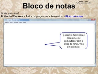 O documento apresenta uma série de programas do Windows 7, incluindo Bloco de Notas, Calculadora, Paint, WordPad, Desfragmentador de Disco, Limpeza de Disco, Backup e Restauração e programas do Microsoft Office. Explica como encontrar e usar cada um desses programas.
