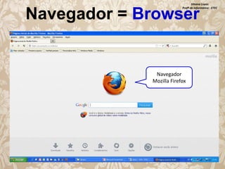 O documento discute vários tópicos relacionados à informática, incluindo navegadores da web, redes locais, placas de rede, servidores, provedores de acesso à internet, protocolos de comunicação e tipos de sites. Exemplos como Firefox, Internet Explorer, Chrome são dados para navegadores, enquanto .com, .gov, .edu são exemplos de extensões de sites.