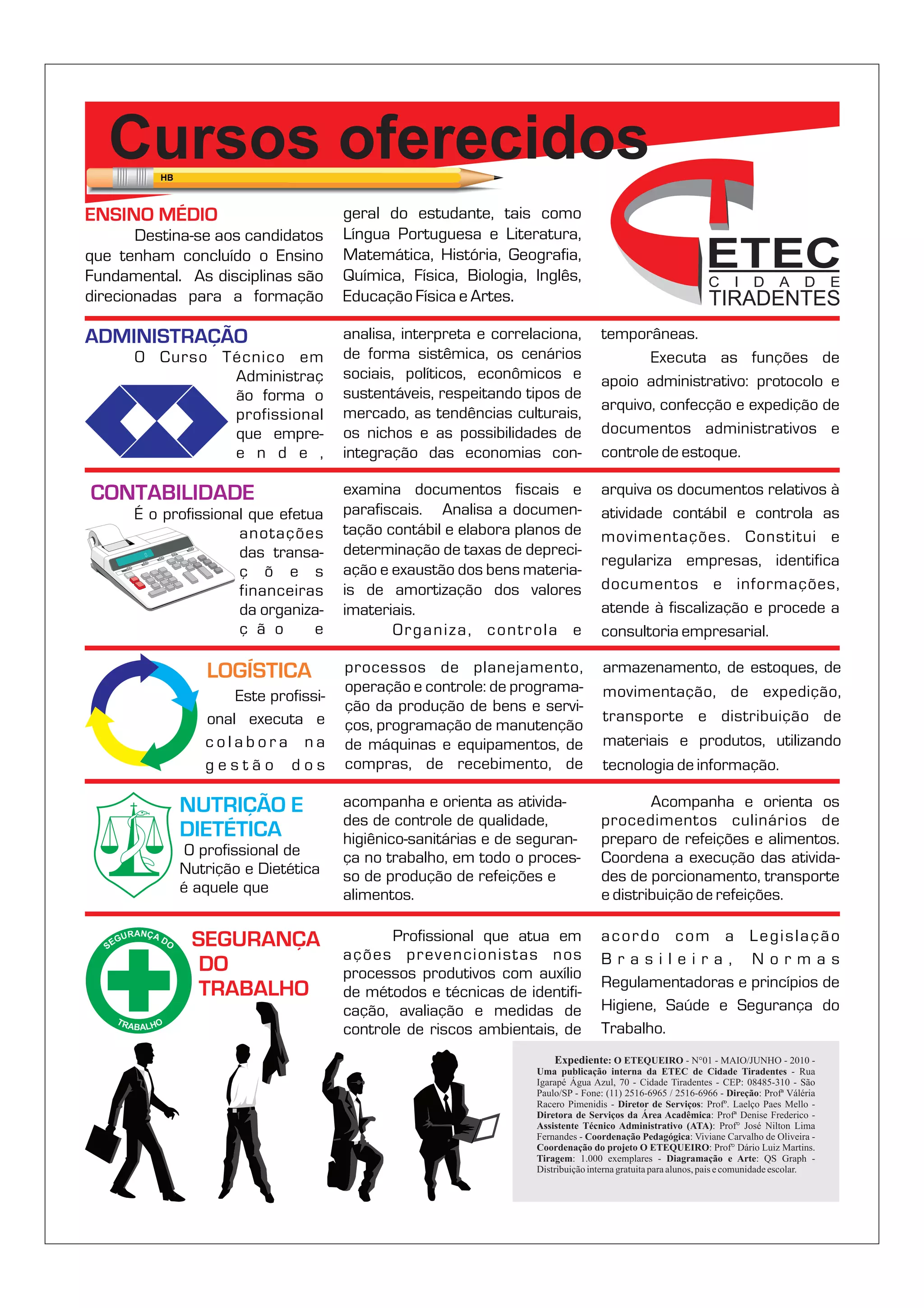 O documento lista os cursos técnicos oferecidos pela ETEC de Cidade Tiradentes, incluindo Ensino Médio, Administração, Contabilidade, Logística e Nutrição e Dietética. Cada curso técnico descreve brevemente as atividades e funções do profissional formado.