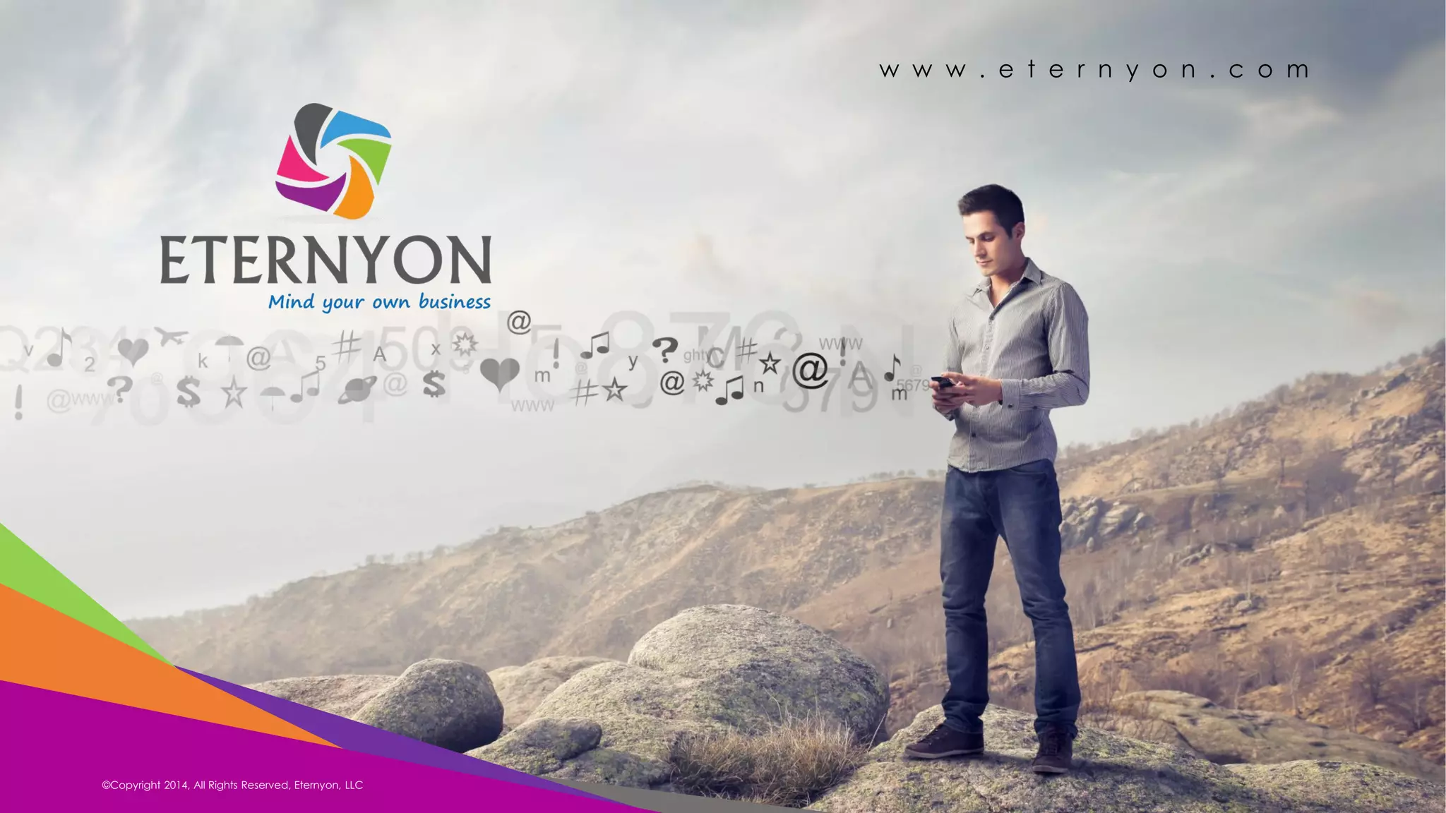 Este documento resume as informações sobre a empresa Eternyon, incluindo sua missão de promover liberdade, qualidade de vida e prosperidade através de um sistema único de bônus global. A empresa opera em publicidade digital, marketing móvel, redes sociais, academia de treinamento e marketing de rede, fornecendo soluções tecnológicas e um sistema de bônus para associados.