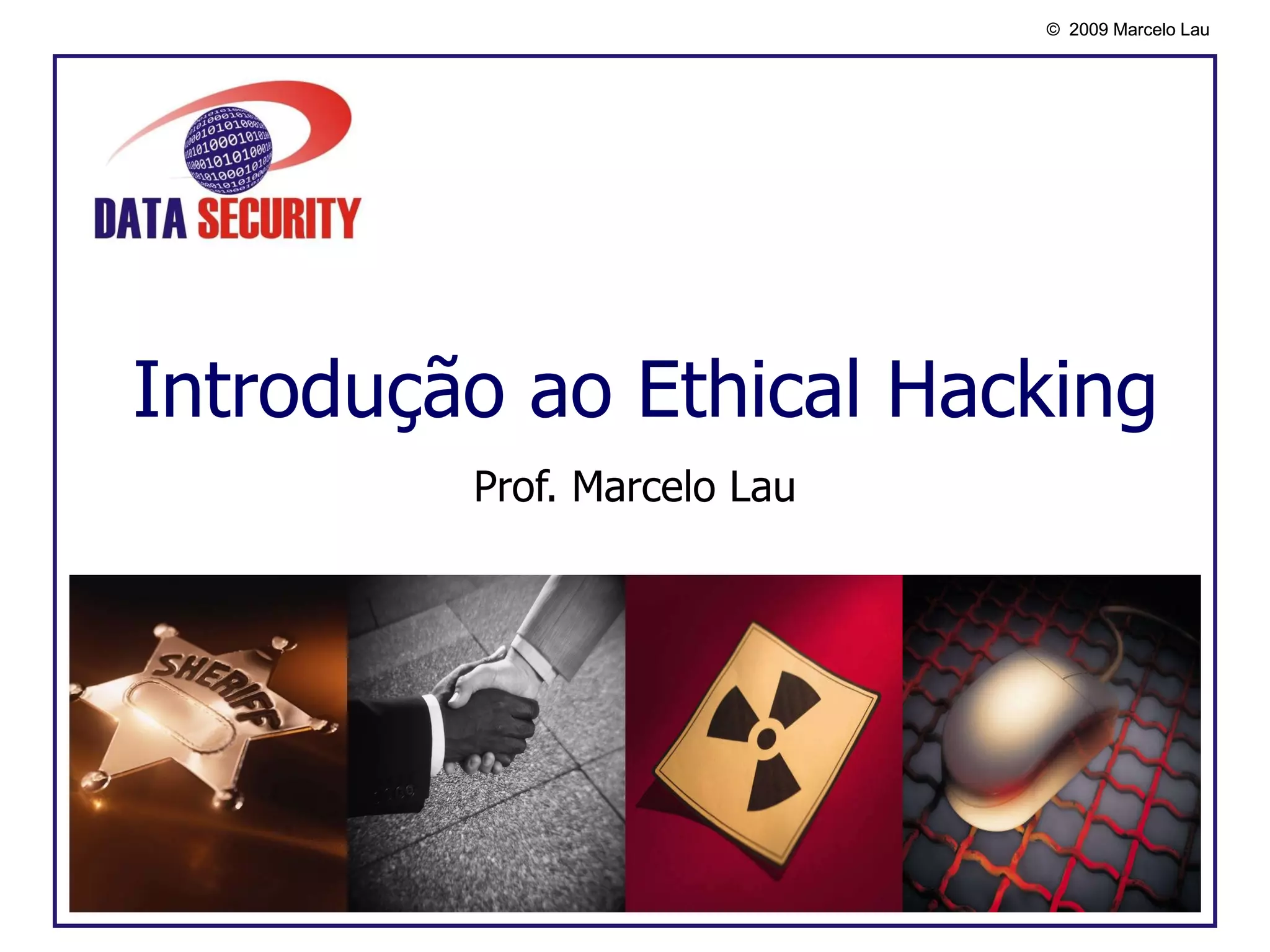 O documento apresenta um resumo sobre o curso de Ethical Hacking ministrado pelo professor Marcelo Lau. O curso aborda conceitos como classes de hackers, psicologia hacker, ferramentas de reconhecimento, varredura de portas, fingerprinting e metodologias como OSSTMM.