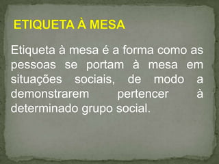 O documento descreve as regras de etiqueta à mesa, incluindo a arrumação correta dos itens na mesa e o comportamento adequado durante as refeições, como a postura correta, o uso apropriado de talheres e copos, e a ordem de serviço das iguarias e bebidas.