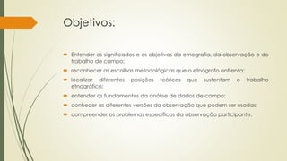 O documento discute os objetivos e conceitos-chave da etnografia e observação. A etnografia envolve a observação participante para entender significados sociais através da descrição de detalhes do cotidiano. Ela pode se concentrar em tribos, subculturas, esfera pública e organizações. Isso envolve escolhas metodológicas e questões teóricas.