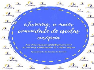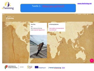 O documento fornece informações sobre o programa eTwinning, que conecta escolas e professores na Europa através de projetos colaborativos online. O documento explica o histórico do programa desde 2005, como professores e escolas podem participar, como encontrar parceiros para projetos, como planejar projetos colaborativos, e reconhecimento e prémios disponíveis para projetos de alta qualidade.