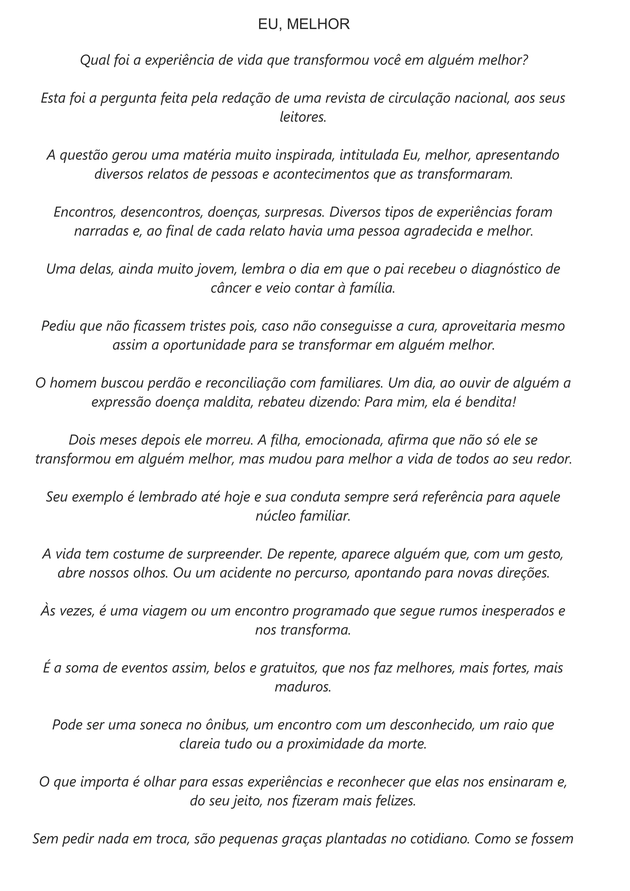 O documento discute como experiências de vida, como doenças, encontros e desencontros, podem transformar as pessoas para melhor. Um exemplo dado é de um homem que recebeu diagnóstico de câncer e usou a oportunidade para se reconciliar com a família e se tornar uma pessoa melhor, servindo de inspiração mesmo após sua morte. Experiências inesperadas na vida, sejam boas ou ruins, podem nos ensinar lições e nos fazer crescer.