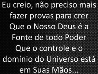 O documento expressa a fé do autor em Deus como a fonte de todo poder e controle do universo. O autor acredita que quanto mais crê, mais milagres consegue ver e que é necessário crer em Deus para não morrer. A fé do autor inclui profecia, mistérios, milagres, avivamentos e o Pentecostes.