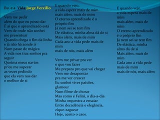 Eu ea Vida Jorge Vercillo Vem me pedir além do que eu posso dar É aí que o aprendizado está Vem de onde não sonhei me presentear Quando chega o fim da linha e já não há aonde ir Num passe de mágica A vida nos traz sonhos pra seguir Queima meus navios pr'eu me superar as vezes pedindo que ela vem nos dar o melhor de si E quando vejo, a vida espera mais de mim mais além, mais de mim O eterno aprendizado é o próprio fim Já nem sei se tem fim De elástica, minha alma dá de si Mais além, mais de mim Cada ano a vida pede mais de mim mais de nós, mais além Vem me privar pra ver o que vou fazer Me prepara pro que vai chegar Vem me desapontar pra me ver crescer Eu sonhei viver paixões, glamour Num filme de chorar Mas como é Felini, o dia-a-dia Minha orquestra a ensaiar Entre decadência e elegância, zique-zaguear Hoje, aceito o caos. E quando vejo, a vida espera mais de mim mais além, mais de mim O eterno aprendizado é o próprio fim Já nem sei se tem fim De elástica, minha alma dá de si Mais além, mais de mim Cada ano a vida pede mais de mim mais de nós, mais além