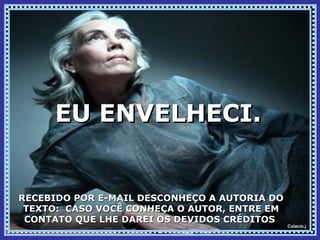 O documento descreve como a autora se sente sobre o envelhecimento. Ela se vê como uma pessoa livre que desfruta da vida e das pequenas coisas, apesar das mudanças físicas trazidas pela idade. A autora aprecia a sabedoria e a compreensão que veio com os anos vividos.