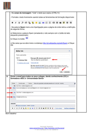 Este documento fornece instruções sobre como reencaminhar e-mails, incluir CC e BCC, incorporar hiperlinks em texto e formatar texto em e-mails. Ele também ensina como reconhecer spam e fornece exemplos práticos para aplicar essas habilidades, como enviar um e-mail sobre spam com hiperlinks e destinatários CC/BCC.