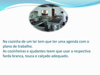 O documento descreve as tarefas diárias realizadas na cozinha de um lar de idosos. Geralmente há três funcionárias - uma cozinheira e duas ajudantes - que preparam as refeições para os idosos, incluindo pequeno-almoço, almoço, lanche e jantar. Elas também preparam tabuleiros individuais para os idosos acamados. Após as refeições, limpam a cozinha e preparam a ementa para o dia seguinte.