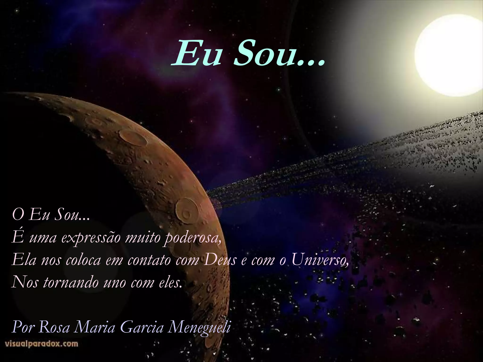 O texto descreve a expressão "Eu Sou..." como uma afirmação poderosa que conecta a pessoa com Deus e o universo, tornando-a uma com eles. A autora lista várias qualidades positivas que a pessoa incorpora ao repetir a frase "Eu Sou...", como luz, equilíbrio e paz.