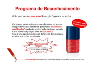 O documento fornece instruções para realizar uma entrevista de iniciação bem-sucedida para tornar uma mulher uma nova Consultora de Beleza Independente da Mary Kay. As etapas incluem: 1) identificar potenciais iniciadas; 2) agendar uma entrevista; 3) apresentar uma imagem de sucesso; 4) estabelecer uma relação; 5) identificar as necessidades da pessoa; 6) compartilhar sua própria história de sucesso com a Mary Kay; 7) falar sobre as oportunidades da Mary Kay; 8) vincular as necess