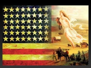 O documento descreve a expansão territorial dos EUA no século XIX. Aborda os antecedentes históricos que levaram à expansão, como a Guerra de Independência e a formação da república, e os fatores que impulsionaram a expansão para o oeste, como a busca por terras e ouro, o crescimento populacional e industrial, e a doutrina do Destino Manifesto. Também discute como a expansão territorial alimentou tensões entre o norte industrializado e o sul agrícola, culminando na Guerra Civil.
