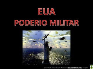 O documento discute o poderio militar dos Estados Unidos e de outras grandes potências mundiais. Apresenta estatísticas sobre o tamanho dos exércitos, gastos militares e arsenais nucleares de países como EUA, Rússia, China, França, Reino Unido, Índia, Paquistão, Coreia do Norte e Israel. Destaca o domínio militar dos EUA e sua posição única como única superpotência após o fim da Guerra Fria.