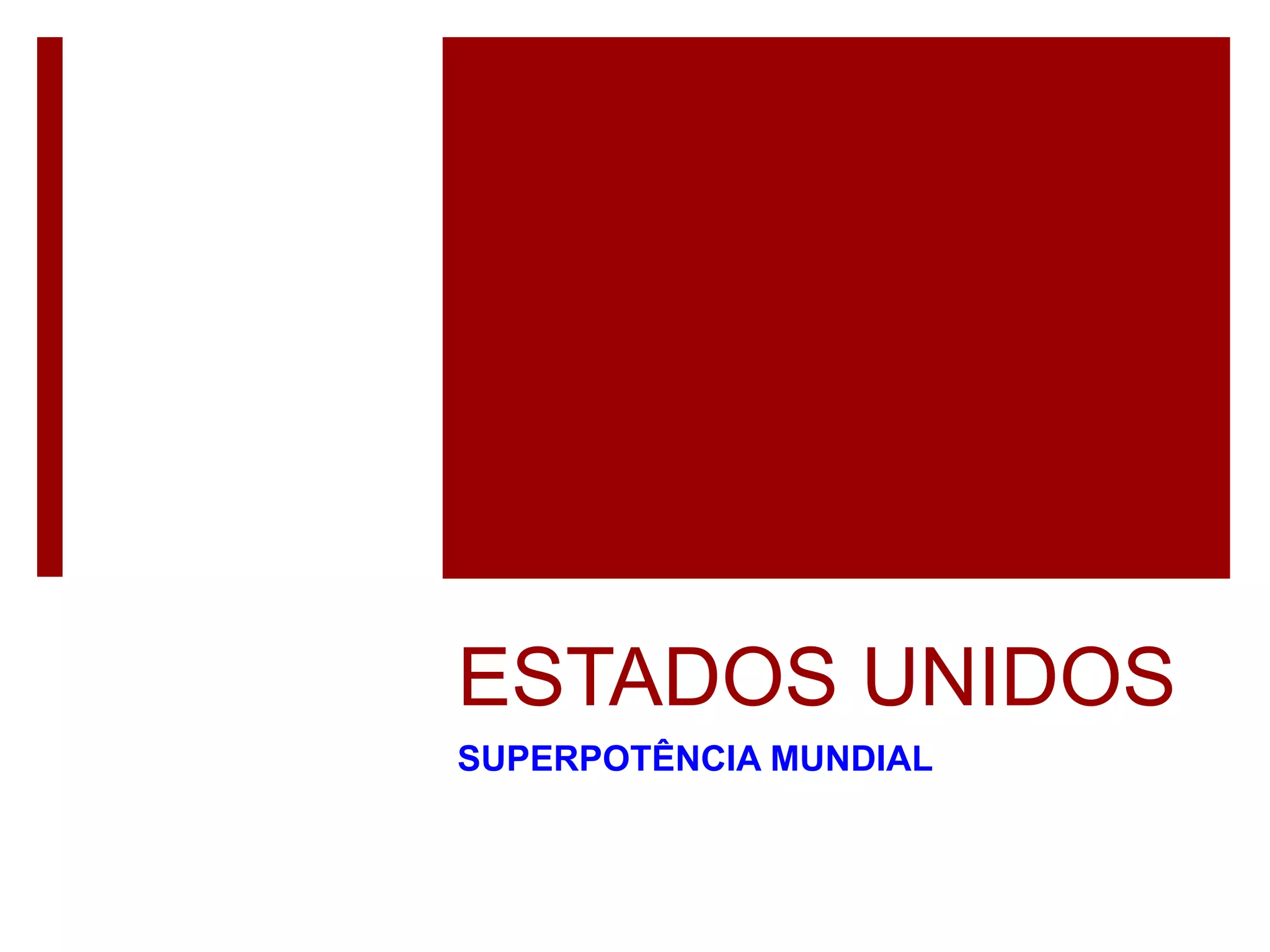 O documento descreve a ascensão dos Estados Unidos como superpotência mundial através da colonização, industrialização, guerras e expansão econômica e cultural. A industrialização no nordeste americano foi impulsionada por recursos naturais como carvão e ferro. As duas guerras mundiais beneficiaram a economia dos EUA. Atualmente exerce forte influência política e econômica globalmente através de organismos como o FMI e é uma potência militar.