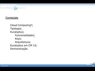 Este documento fornece um resumo sobre Cloud Computing e a plataforma open source Eucalyptus. Explica os conceitos de Cloud Computing, tipos de modelos de negócio, arquitetura e componentes do Eucalyptus, e como instalar o Eucalyptus no Centro de Microcomputadores 15.