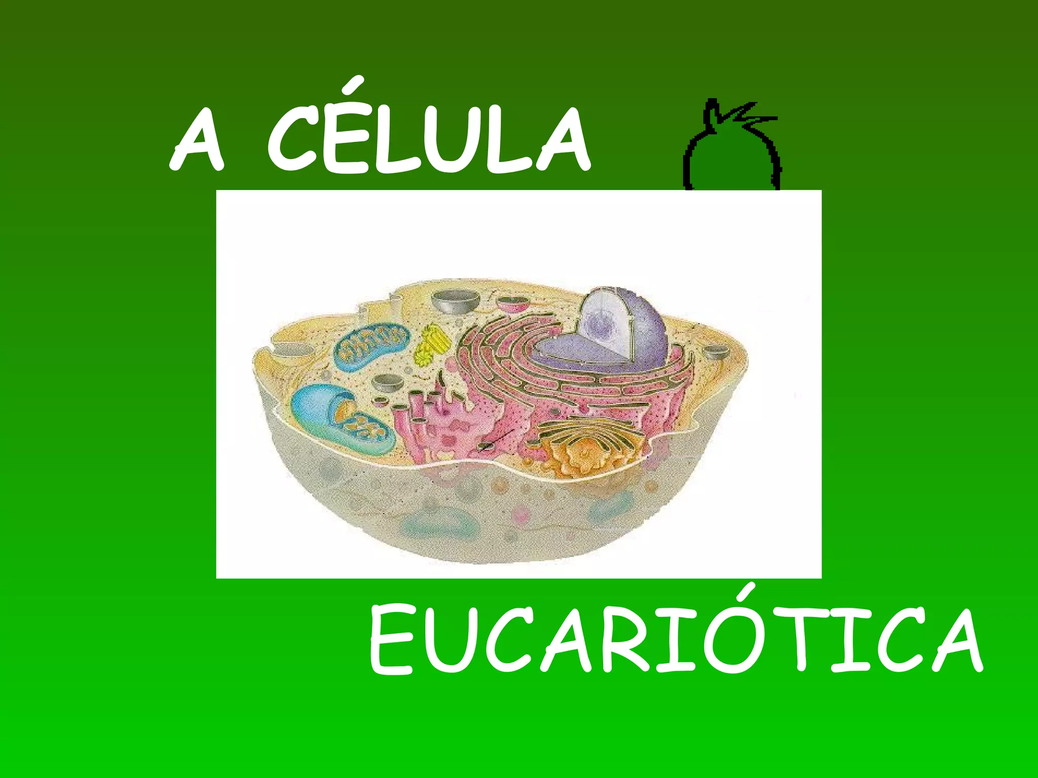 O documento descreve as características das células eucarióticas, comparando-as com as procarióticas. As células eucarióticas possuem organelas como mitocôndrias, cloroplastos e um núcleo envolto por uma membrana nuclear, ao contrário das procarióticas. O texto também diferencia as células eucarióticas animais e vegetais, destacando a presença de plastídios e parede celular nas células vegetais.