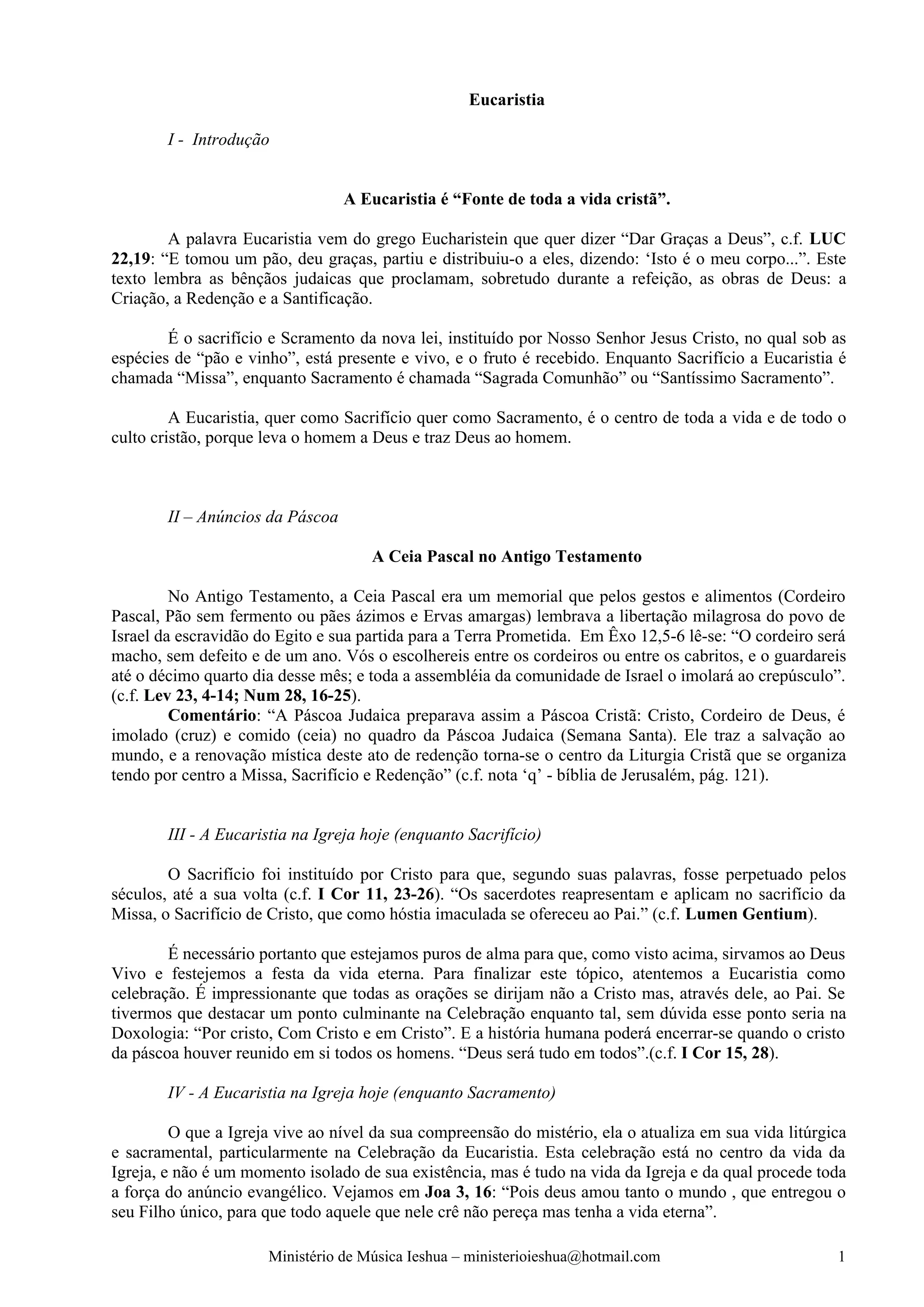 O documento discute a Eucaristia na religião cristã em 5 seções: 1) introdução sobre o significado de Eucaristia; 2) anúncios da Páscoa no Antigo Testamento; 3) Eucaristia como sacrifício na Igreja hoje; 4) Eucaristia como sacramento na Igreja hoje; 5) presença real de Jesus na Eucaristia. O texto defende que a Eucaristia é o centro da vida cristã e que, durante a ceia, o pão e o vinho se tornam realmente o