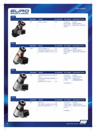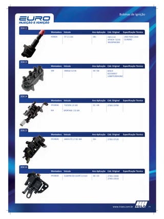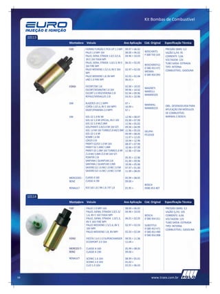 O documento lista produtos para automóveis, incluindo kits de bombas de combustível, mangueiras, bombas completas, pré-filtros e outros itens, com especificações técnicas e aplicações por montadora e veículo. É fornecido o código original de cada peça e a página onde cada produto inicia.