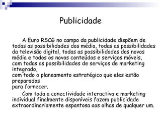 A Euro RSCG é uma grande agência de publicidade global que oferece uma variedade de serviços de marketing e comunicação. Ela possui 233 escritórios em 75 países diferentes e é especializada em publicidade, marketing interativo, serviços de saúde e comunicação corporativa. Alguns dos principais clientes globais incluem Volvo, Danone, Peugeot, Citroen, L'Oreal, Intel e Nestlé.