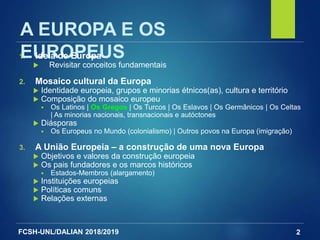 Este documento apresenta um programa de estudos sobre a Europa e os Europeus, abordando três tópicos principais: 1) a ideia de Europa e a identidade cultural europeia, 2) o mosaico cultural formado pelos diferentes grupos étnicos europeus, e 3) a construção da União Europeia e suas instituições e políticas. O documento fornece detalhes sobre os principais grupos étnicos europeus e a história e cultura da Grécia Antiga.