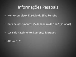 Eusébio foi um jogador de futebol português nascido em Moçambique que jogou principalmente pelo Benfica, onde marcou 638 gols em 614 jogos e ajudou o clube a vencer 11 campeonatos portugueses e a Taça dos Clubes Campeões Europeus de 1961-1962. Ele também jogou 64 vezes pela seleção portuguesa e marcou 41 gols, ajudando Portugal a terminar em terceiro na Copa do Mundo de 1966. Eusébio recebeu vários prêmios individuais por sua carreira de sucess