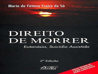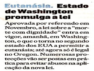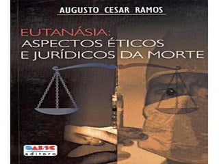 O documento discute a eutanásia, especificamente o caso de uma mulher italiana em coma por 17 anos cujo presidente permitiu a eutanásia contra os desejos do primeiro-ministro. Também descreve os tipos de eutanásia ativa e passiva e apresenta o caso de um gorila branco que foi sacrificado devido a um câncer incurável.