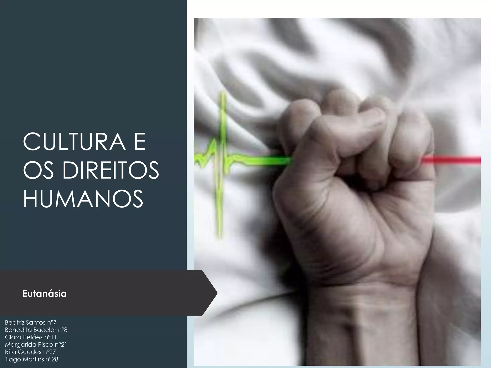 O documento discute o tema da eutanásia, definindo-a como a morte de um doente terminal pelo médico para pôr fim ao seu sofrimento. Apresenta os tipos de eutanásia, países que a legalizaram e as opiniões dos portugueses, com a maioria tendo posições favoráveis, embora o tema continue em debate sobre se viola ou não o direito à vida.