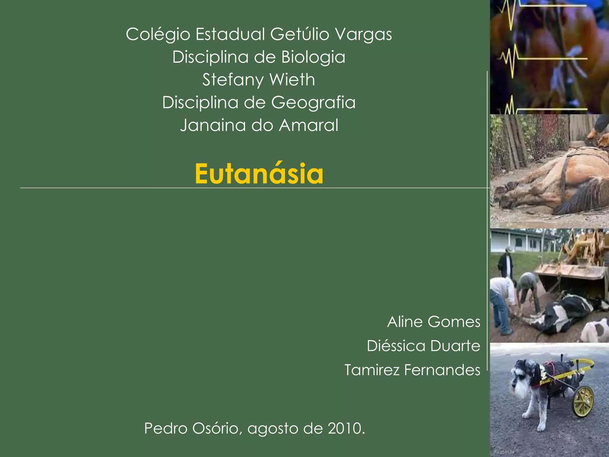 O documento discute os tipos de eutanásia, agentes utilizados para realizá-la e a posição de diferentes países sobre o tema. A eutanásia pode ser ativa ou passiva e voluntária ou involuntária. Barbitúricos, T-61 e gases como dióxido de carbono são comumente usados. Holanda, Bélgica e Suíça permitem em certas circunstâncias, enquanto Brasil a considera ilegal. Há argumentos a favor, como evitar sofrimento, e contra, como considerá-la um crime