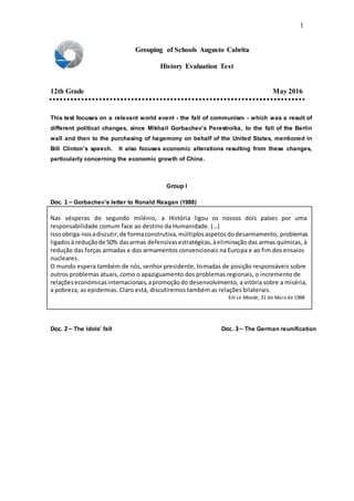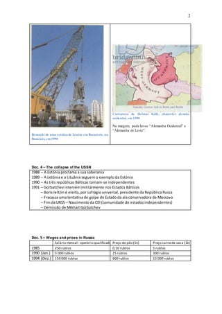 1. O documento discute a queda do comunismo na Europa Oriental entre 1985-1991, incluindo fatores que levaram ao processo, mudanças políticas e dificuldades na transição para a economia de mercado.