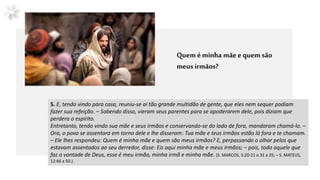 1) Jesus estava rodeado por uma grande multidão de pessoas que não podiam nem comer. 2) Sua mãe e irmãos vieram chamá-lo, mas ele perguntou quem era sua mãe e irmãos. 3) Jesus disse que aqueles que fazem a vontade de Deus são sua verdadeira família.