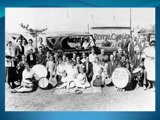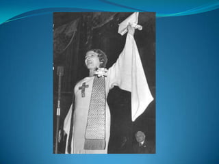 O documento descreve a vida e obra de Aimee Semple McPherson, uma pioneira do evangelismo no início do século XX. Ela se converteu ao cristianismo ainda jovem e fundou o Ministério do Evangelho Quadrangular, pregando sobre salvação, batismo no Espírito Santo, cura divina e segunda vinda de Cristo. Sua mensagem se espalhou pelo mundo e a Igreja Evangélica Quadrangular foi fundada no Brasil em 1951.