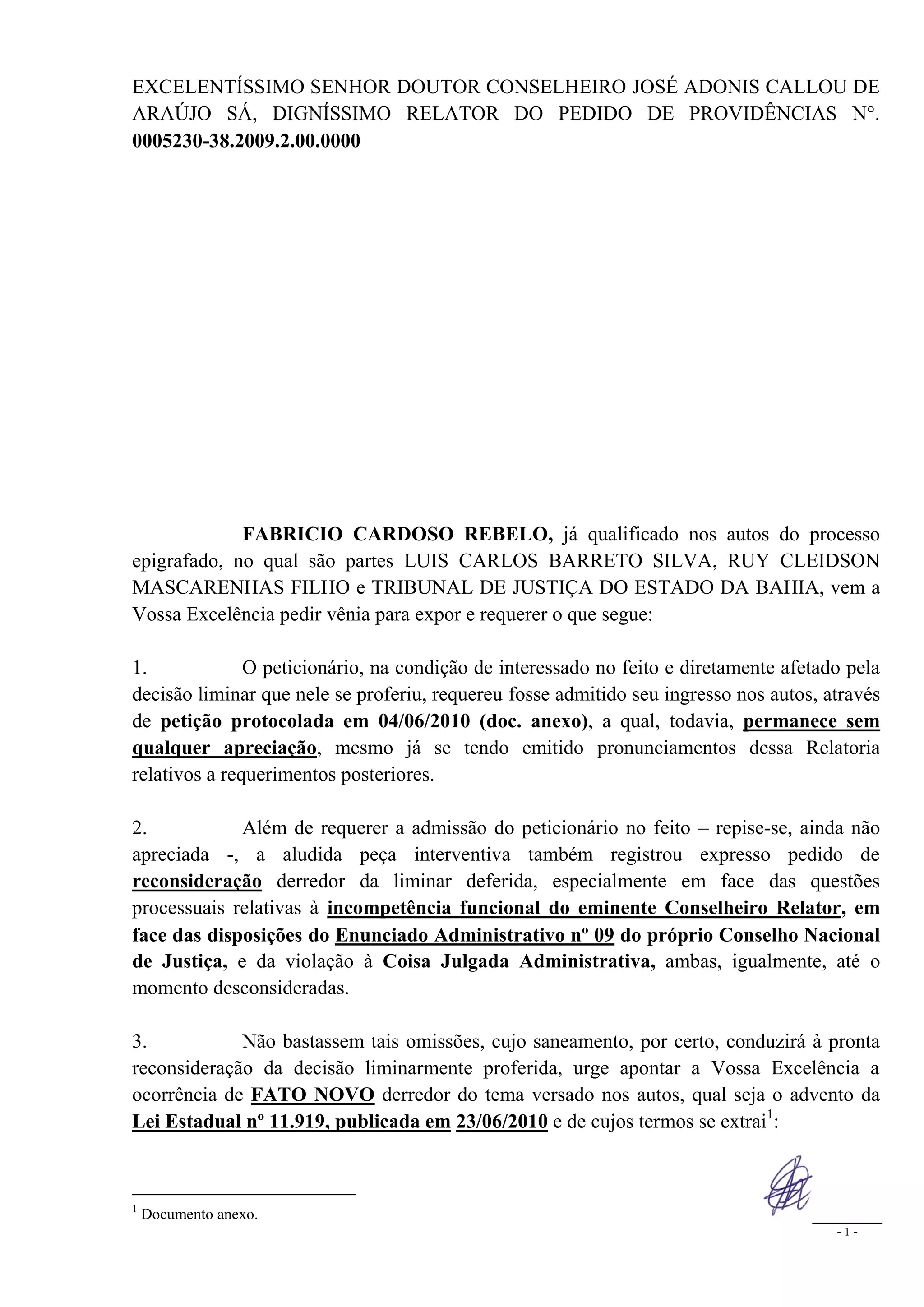 1. O documento pede a admissão do peticionário no processo e reconsideração da decisão liminar.