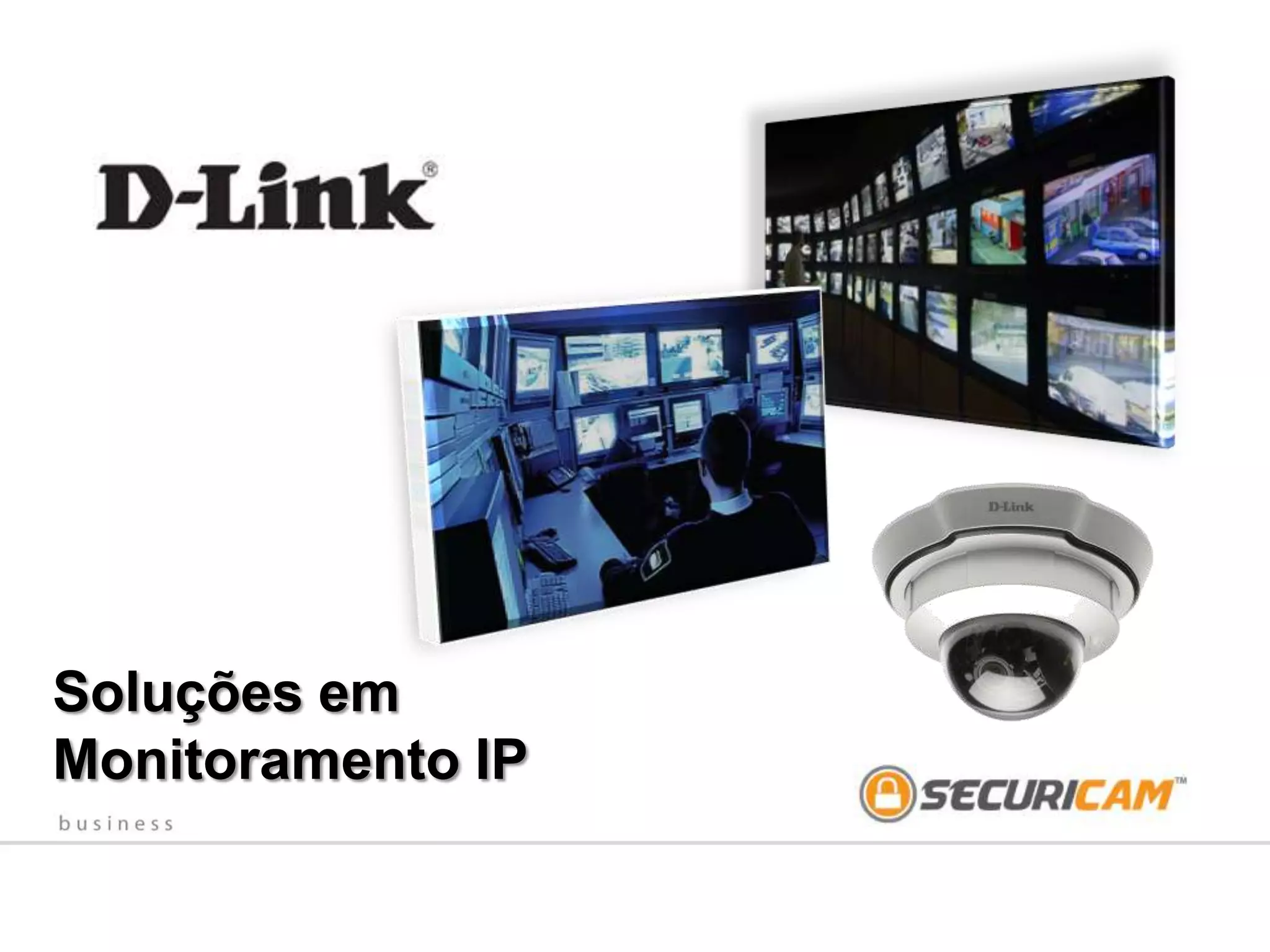 O documento discute soluções de monitoramento IP da D-Link, incluindo câmeras IP, switches, firewalls e softwares de gerenciamento. Apresenta as vantagens do monitoramento IP sobre sistemas CFTV, como maior flexibilidade, qualidade e funcionalidades avançadas.