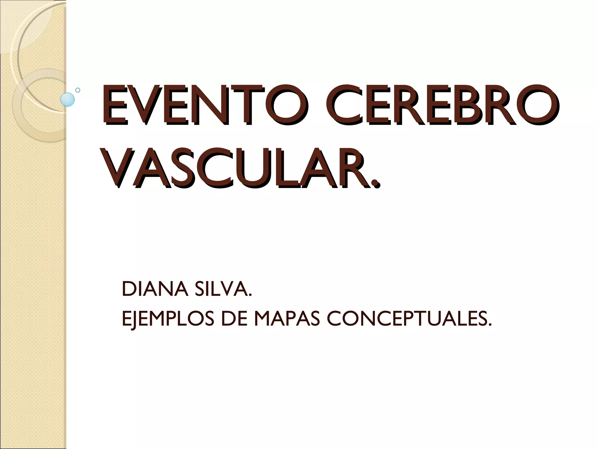 O documento discute um evento cerebrovascular de uma paciente chamada Diana Silva, fornecendo a definição de ECV, detalhando os cuidados de enfermagem necessários e as atividades de enfermagem-chave para o tratamento.