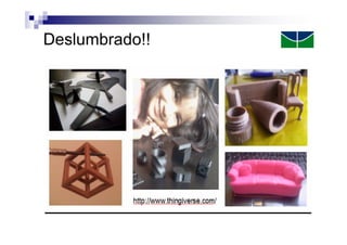 O documento apresenta um relatório sobre objetos impressos em 3D pelo professor Marcelino M Andrade da Universidade de Brasília, incluindo uma mão, remixes e objetos que voam ou se combinam, explorando as possibilidades da impressão 3D.
