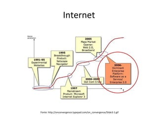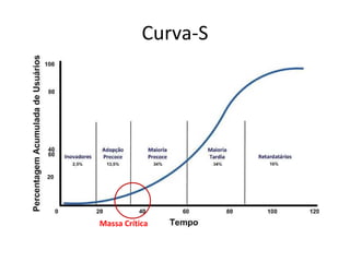 O documento discute a importância da inovação aberta e da participação dos usuários no processo de inovação. Apresenta exemplos históricos de como as inovações foram inicialmente protótipos e depois se tornaram massificadas, e discute como a difusão de novas tecnologias segue padrões semelhantes à curva em "S". Conclui que as fronteiras entre o mundo físico e digital vão se tornar cada vez mais indistintas no futuro e que o papel dos usuários será cada vez mais importante.