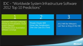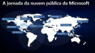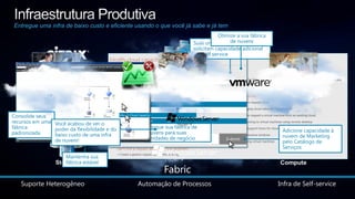 O documento discute os custos de aquisição e operação de um datacenter, com foco na computação em nuvem para reduzir esses custos. Apresenta o portfólio da Microsoft para entregar TI como serviço através do System Center, permitindo provisionamento e padronização de serviços na nuvem de forma flexível e com custo efetivo.