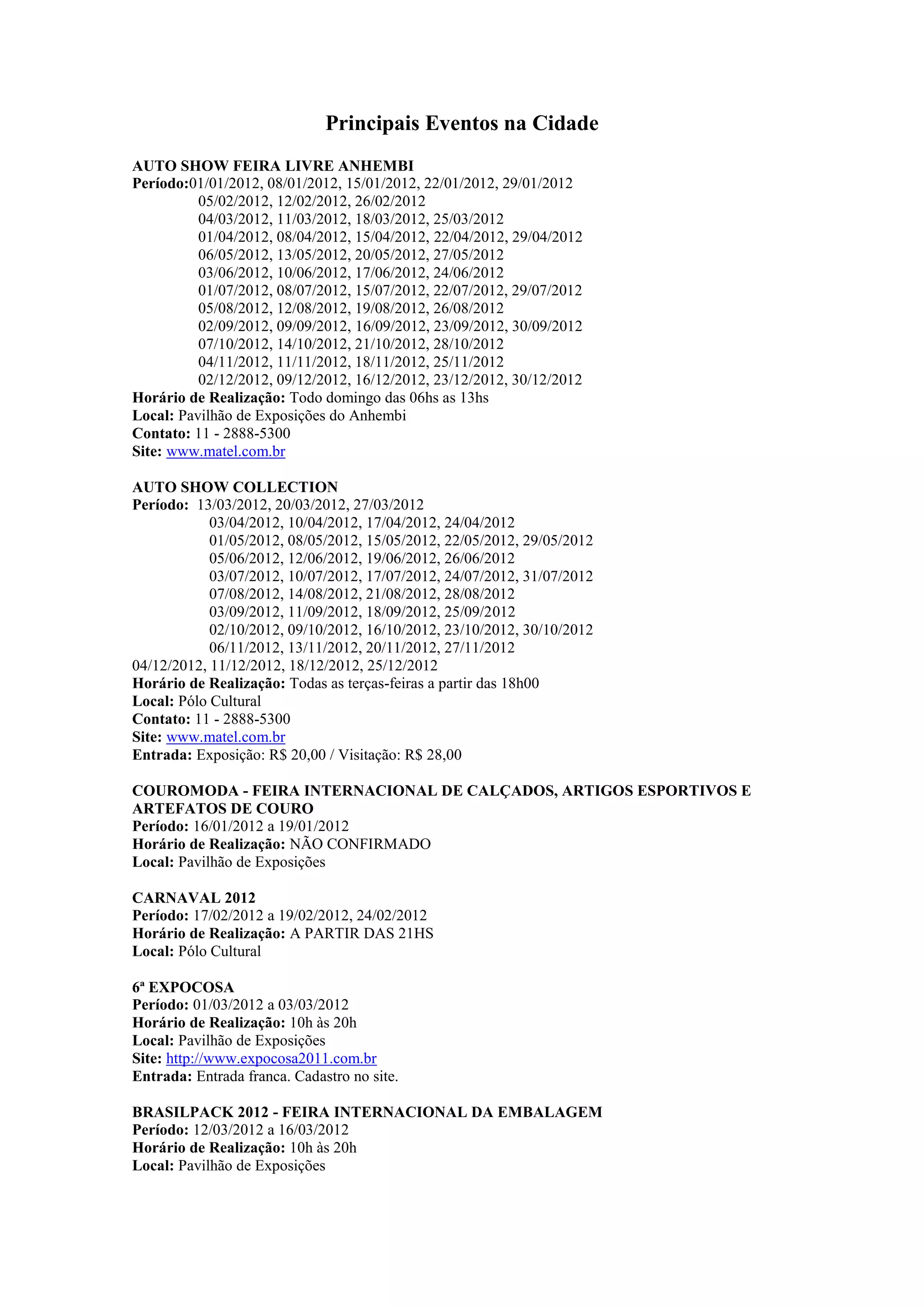 O documento lista diversos eventos que ocorrerão na cidade entre janeiro e novembro de 2012, incluindo feiras de automóveis, exposições, shows musicais e o Grande Prêmio do Brasil de Fórmula 1.