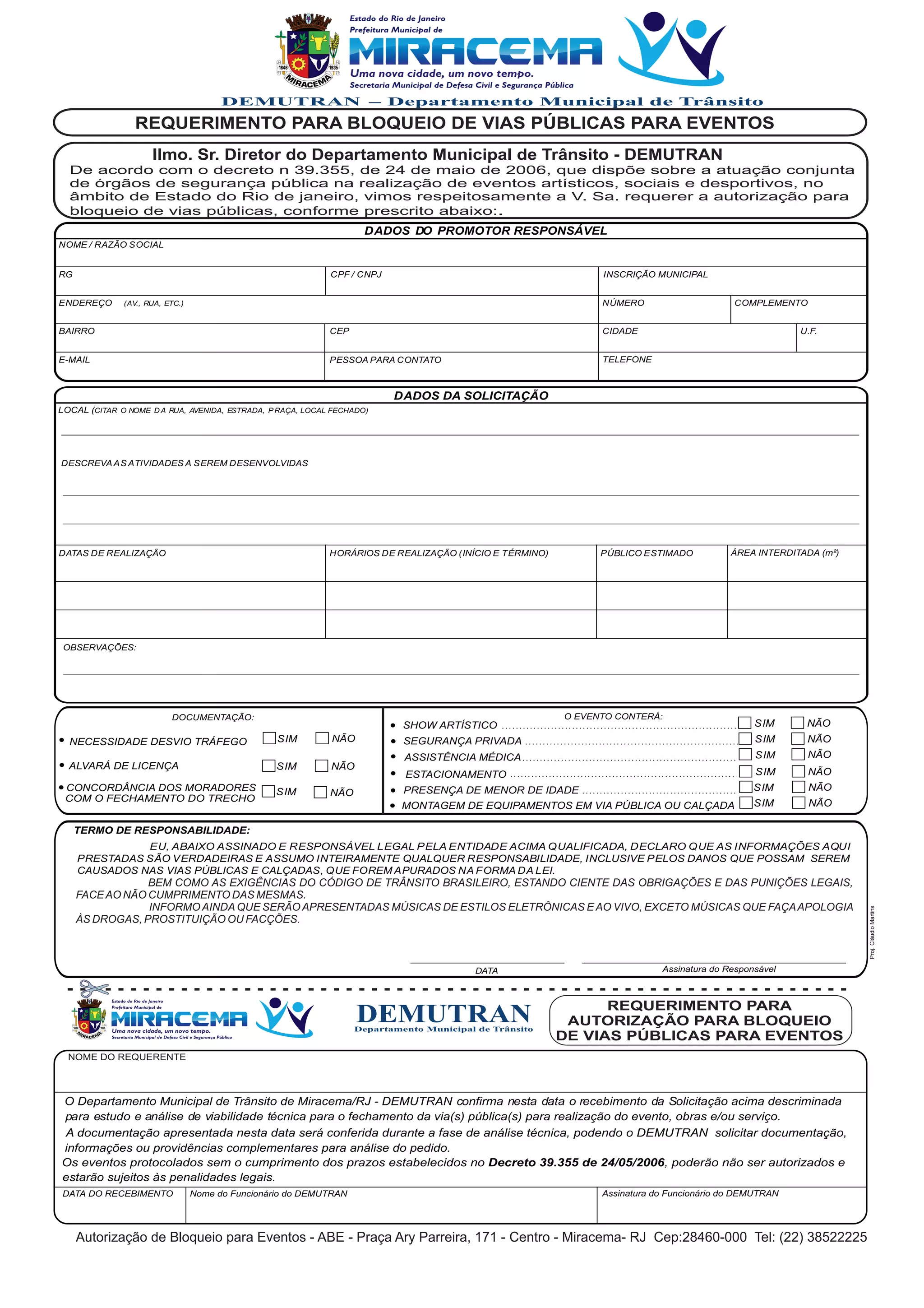 O documento é um requerimento para bloqueio de vias públicas para um evento. Contém informações sobre o local, datas, horários, público estimado e atividades do evento, além dos dados do promotor responsável e uma declaração de responsabilidade por possíveis danos.