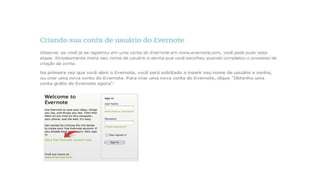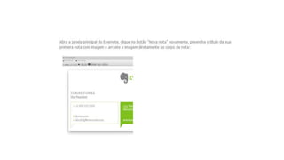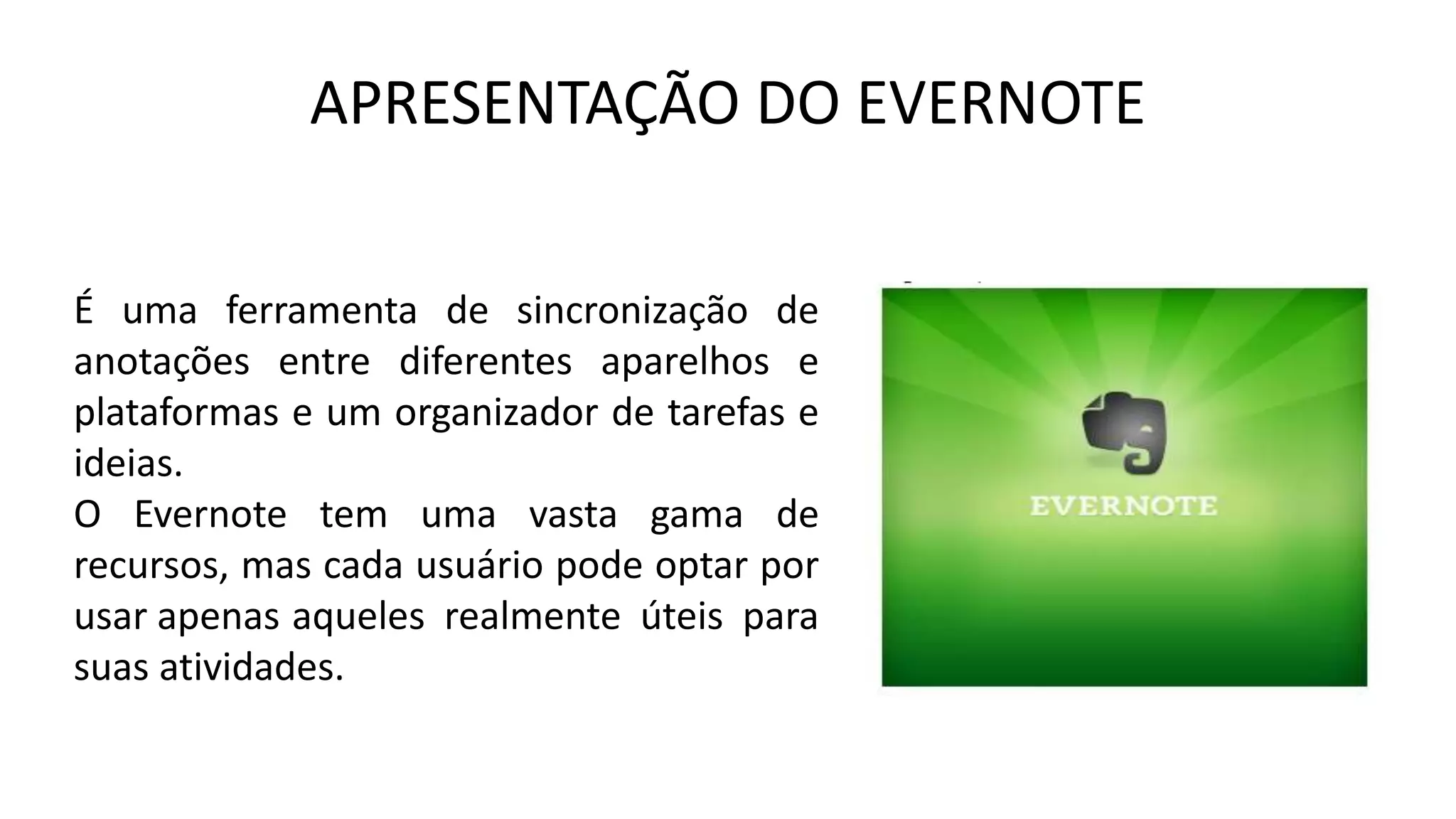 O documento descreve o Evernote, uma ferramenta de organização e sincronização de anotações entre dispositivos. O Evernote permite elaborar e arquivar documentos, fotos, áudios e vídeos e compartilhá-los entre dispositivos após a instalação e sincronização.