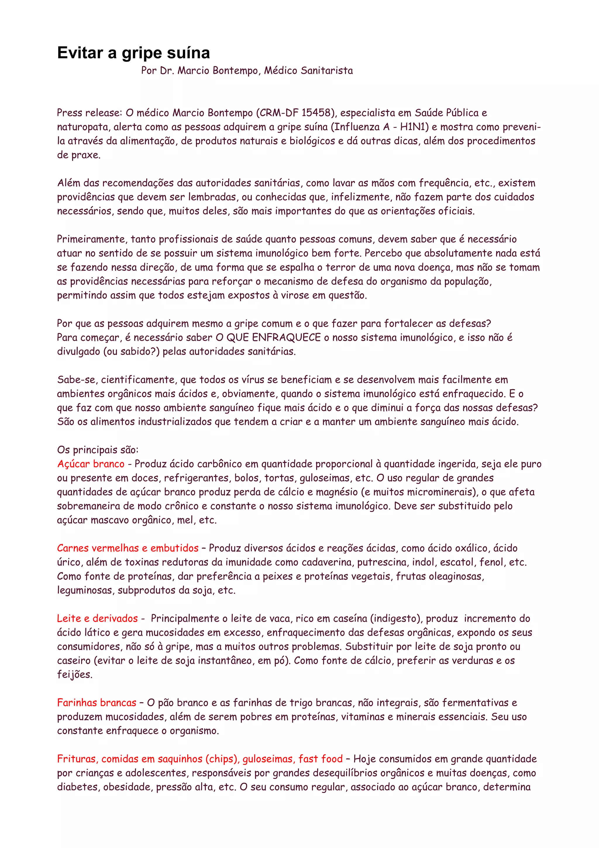 O documento fornece dicas para prevenir a gripe suína através de uma alimentação saudável, produtos naturais, estilo de vida equilibrado e suplementos. Ele recomenda evitar alimentos industrializados e açúcar branco, e consumir alimentos que fortaleçam o sistema imunológico como alho, própolis, gengibre, cogumelo do sol e frutas. Também enfatiza a importância de reduzir o estresse e ter uma vida ativa ao ar livre.