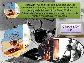 O documento descreve a evolução da tecnologia computacional, desde os primeiros dispositivos mecânicos como o ábaco até os computadores digitais modernos, destacando marcos como o ENIAC, o transistor e o microprocessador.