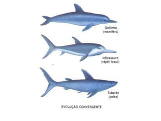 EVOLUÇÃO CONVERGENTE ou convergência adaptativa caracterizada pela adaptação de diferentes organismos a uma condição ecológica igual. Ex.: as formas do corpo do golfinho, dos peixes, especialmente tubarões, e de um réptil fóssil chamado ictiossauro são bastante semelhantes, adaptadas à natação. Neste caso, a semelhança não é sinal de parentesco, mas resultado da adaptação desses organismos ao ambiente aquático.