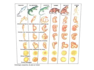 EMBRIOLOGIA COMPARADA o estudo comparado da embriologia de diversos vertebrados mostra a grande semelhança de padrão de desenvolvimento inicial. À medida que o embrião se desenvolve, surgem características individualizantes e as semelhanças diminuem.