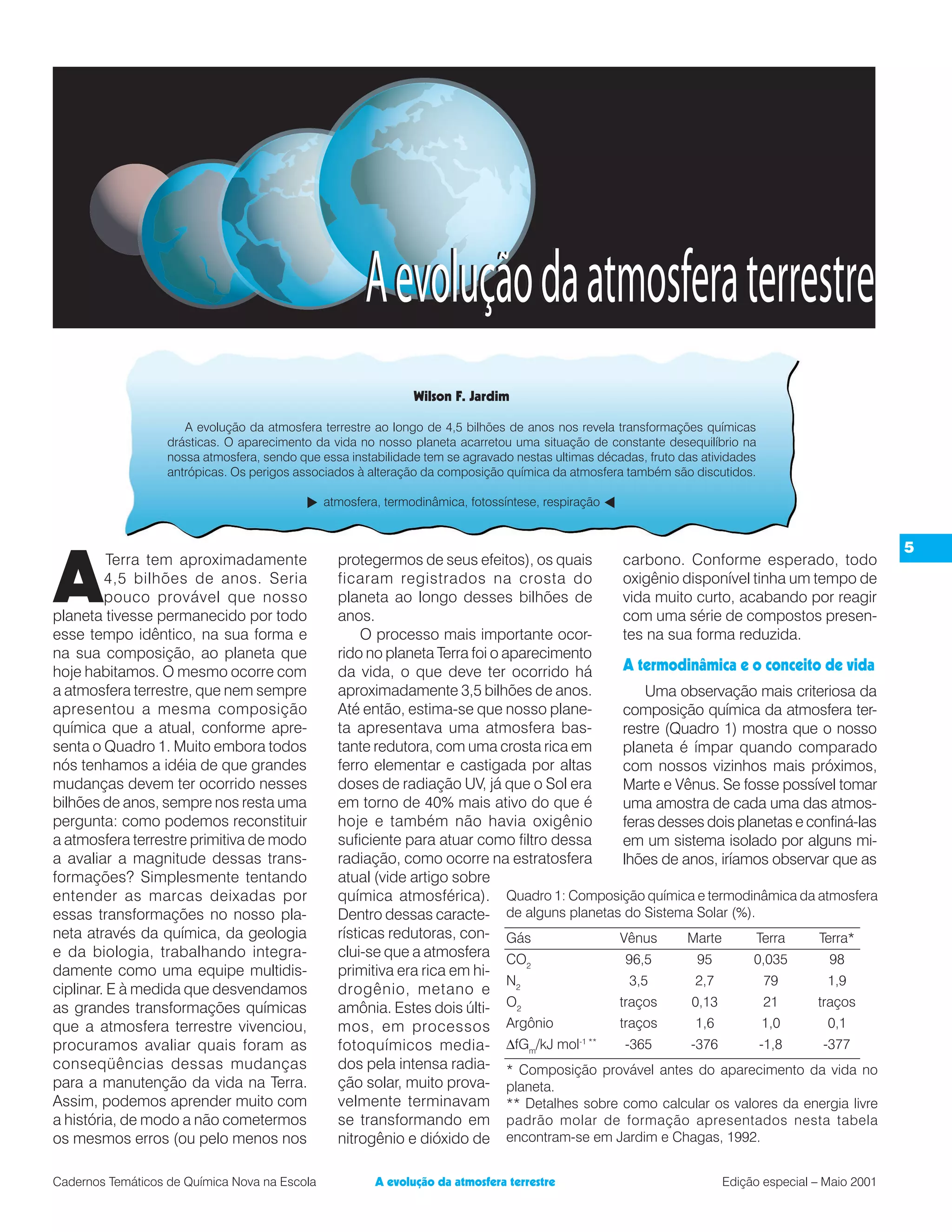O documento descreve a evolução da atmosfera terrestre ao longo de 4,5 bilhões de anos, marcada por drásticas transformações químicas. O aparecimento da vida trouxe instabilidade à atmosfera, agravada pelas atividades humanas. Analisando as marcas deixadas por essas transformações, é possível entender como a vida se manteve no planeta.