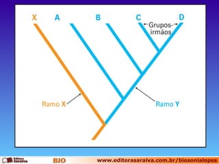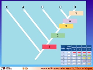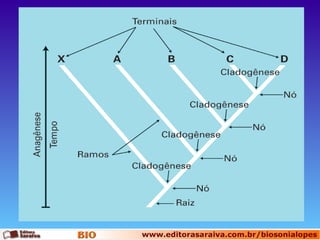 O documento discute os conceitos de sistemática evolutiva e filogenética. A sistemática filogenética usa características derivadas compartilhadas para reconstruir a filogenia e formar grupos monofiléticos nos cladogramas. Os processos evolutivos de anagênese e cladogênese geram novidades e separam populações, respectivamente. Cladogramas representam as relações evolutivas e o princípio da parcimônia busca marcar o menor número de mudanças.