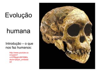 Este documento discute a evolução humana, começando com as características que nos diferenciam de outros primatas, como bipedalismo e habilidade de manipulação. Também descreve fósseis importantes como Ardi, Lucy e Luzia que preenchem lacunas na compreensão da evolução humana. Finalmente, discute como fatores genéticos e culturais contribuíram para tornar os humanos únicos.