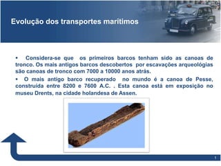 O documento descreve a evolução dos meios de transporte marítimos e aéreos ao longo da história, desde as primeiras canoas de tronco até os modernos navios, submarinos, aviões e dirigíveis. Inclui detalhes sobre inventores pioneiros e marcos históricos, como a primeira viagem de um barco a vapor em 1819 e o primeiro voo controlado de um avião pelos irmãos Wright em 1903.